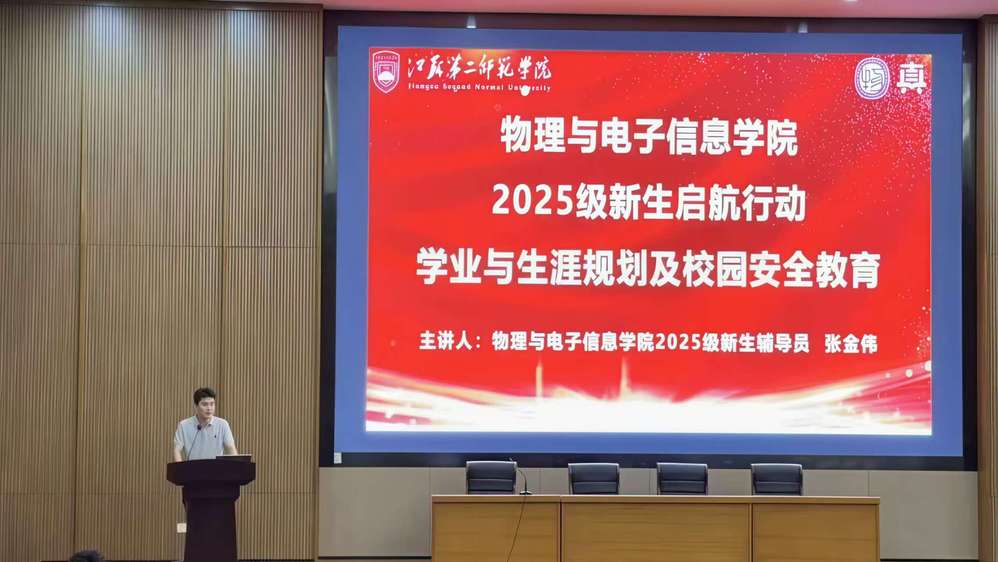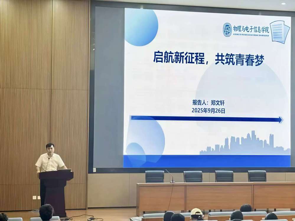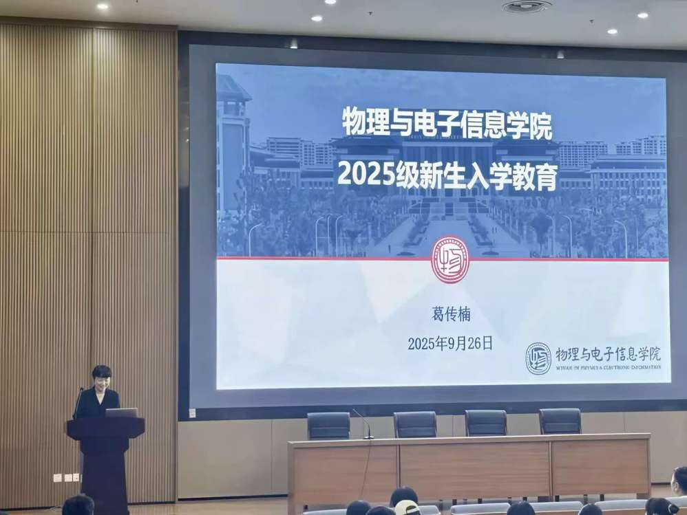 9月26日下午3点,物理与电子信息学院在图书馆报告厅举行2025级新生开学典礼。物理与电子信息学院党总支书记葛传楠、副院长郑文轩、特聘教授李兴鳌、求真书院党总支副书记葛静出席本次开学典礼,全体2025 级新生参加,开学典礼由辅导员张金伟主持。