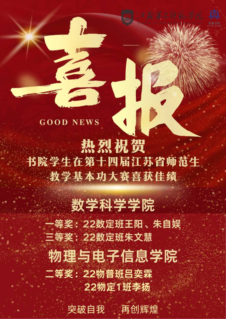近日,由江苏省教育厅主办、省教师教育专业指导委员会承办的第十四届江苏省师范生教学基本功大赛圆满结束。我院数学组王阳、朱自娱荣获一等奖,朱文慧荣获三等奖;物理组吕奕霖、李扬荣获二等奖。